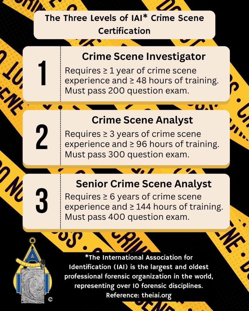 As a proudly IAI-certified Crime Scene Analyst, I created this infographic to outline the path to certification through the International Association for Identification (IAI) — the gold standard in forensic science.